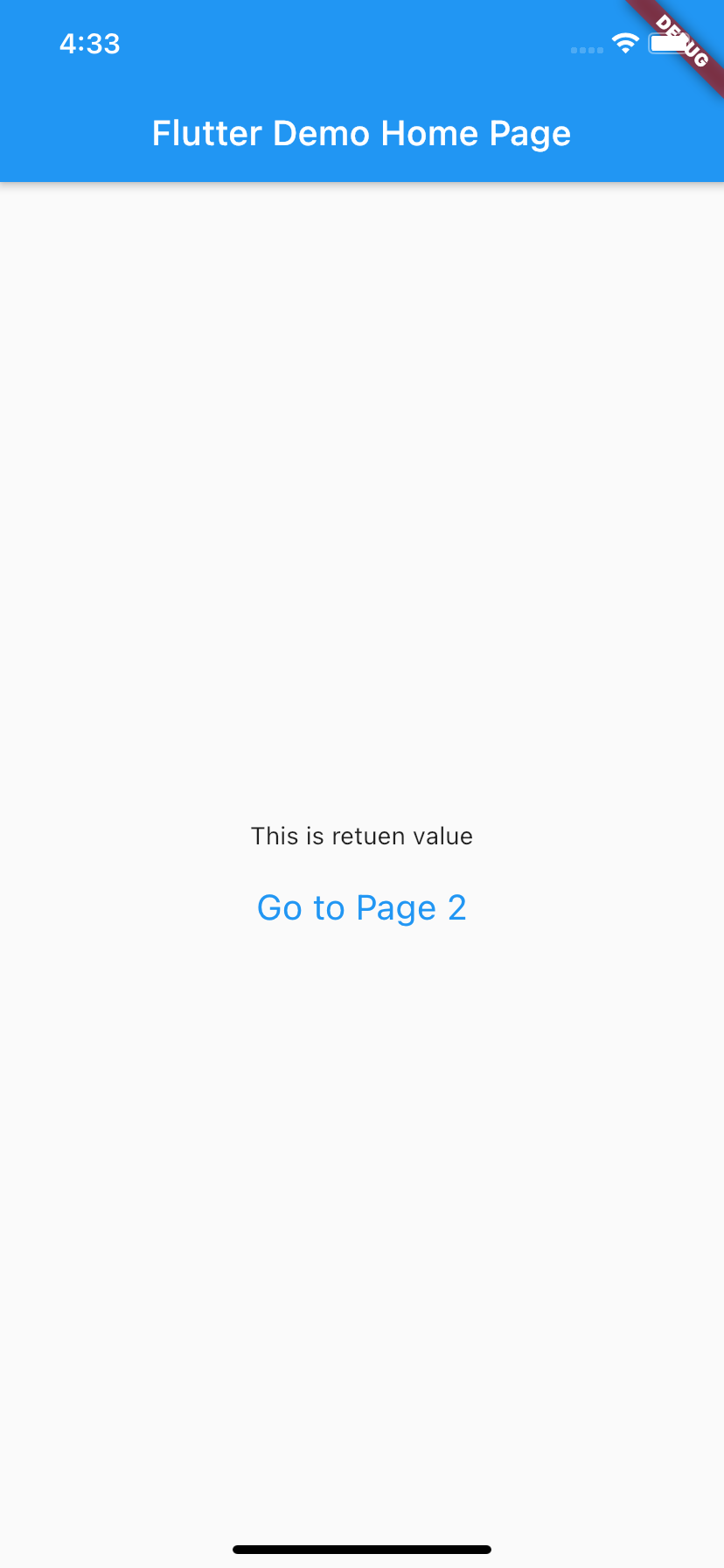 class _MyHomePageState extends State<MyHomePage> { String title = "This is Page 1"; @override Widget build(BuildContext context) { return Scaffold( appBar: AppBar( title: Text(widget.title), ), body: Center( child: Column( mainAxisAlignment: MainAxisAlignment.center, children: [ Text(title), GestureDetector( onTap: () async { final data = await Navigator.push(context, MaterialPageRoute(builder: (context) => PageTwo())); }, child: Container( padding: EdgeInsets.only(top: 20), child: Text( "Go to Page 2", style: TextStyle(color: Colors.blue, fontSize: 20), )), ) ], ), ), ); } }title 변수에 초기값을 넣어주었고
