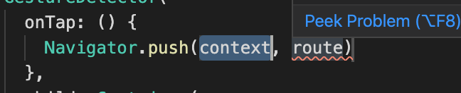 이제 onTap 함수 안에 Navigator push를 구현해야합니다. 그런데 이때 context, route 두개의 속성이 필요합니다.